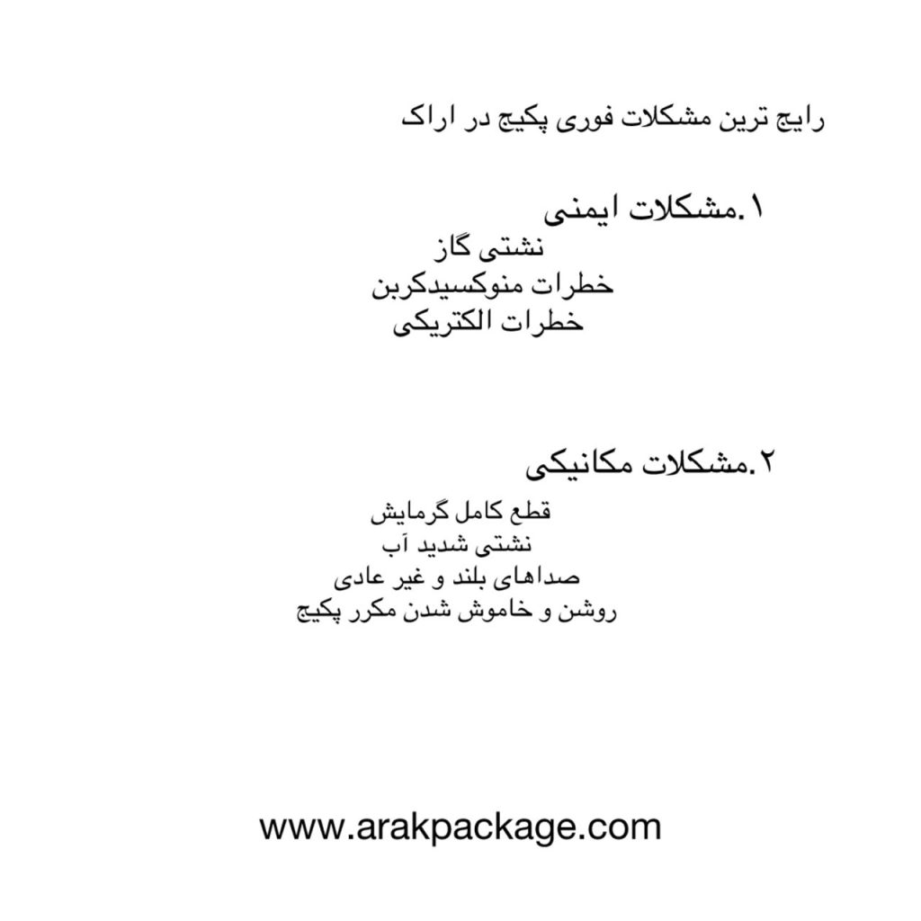 مشکلات پکیج سیستمهای گرمایشی که نیاز به رسیدگی سریع دارند، معمولاً به مواردی مربوط میشوند که یا ایمنی ساکنان را به خطر میاندازند یا باعث قطع کامل گرمایش و آب گرم در شرایط حساس میشوند. بهطور کلی، مشکلات فوری پکیج در اراک به دو دسته اصلی تقسیم میشوند: مشکلات ایمنی و:مشکلات مکانیکی.